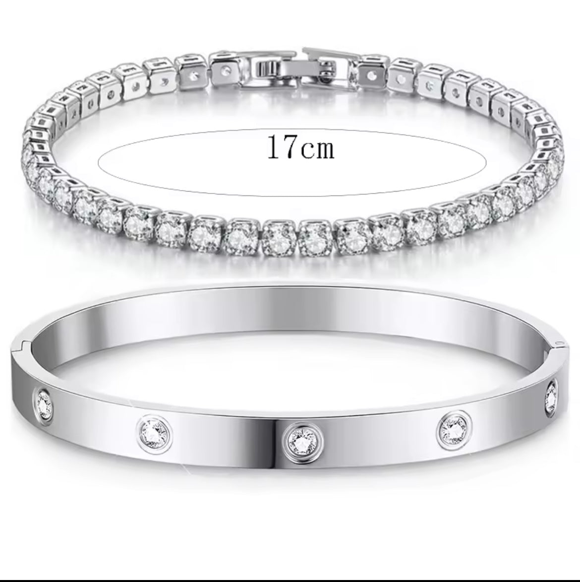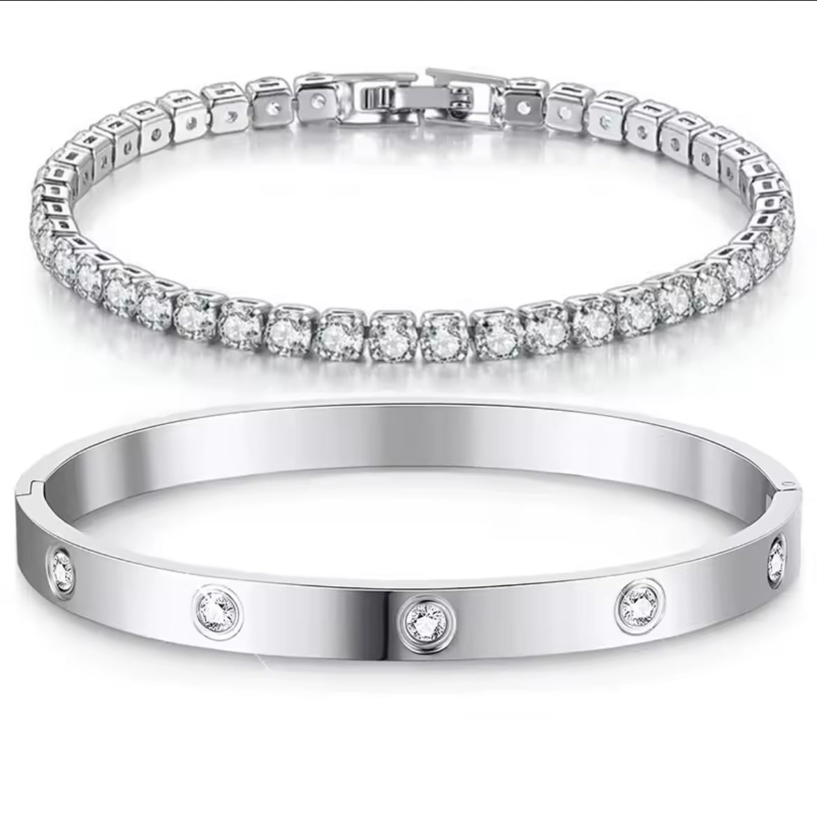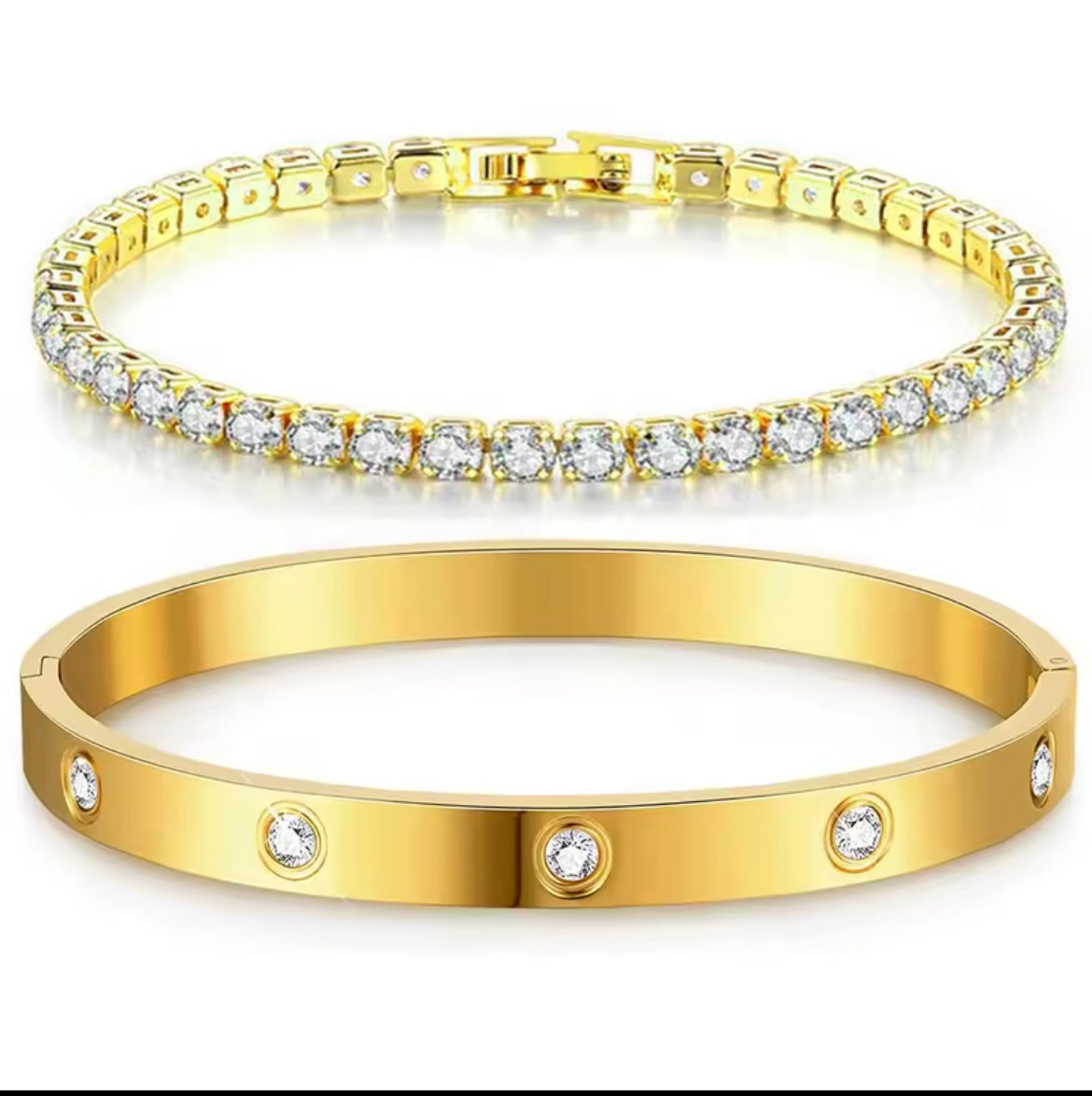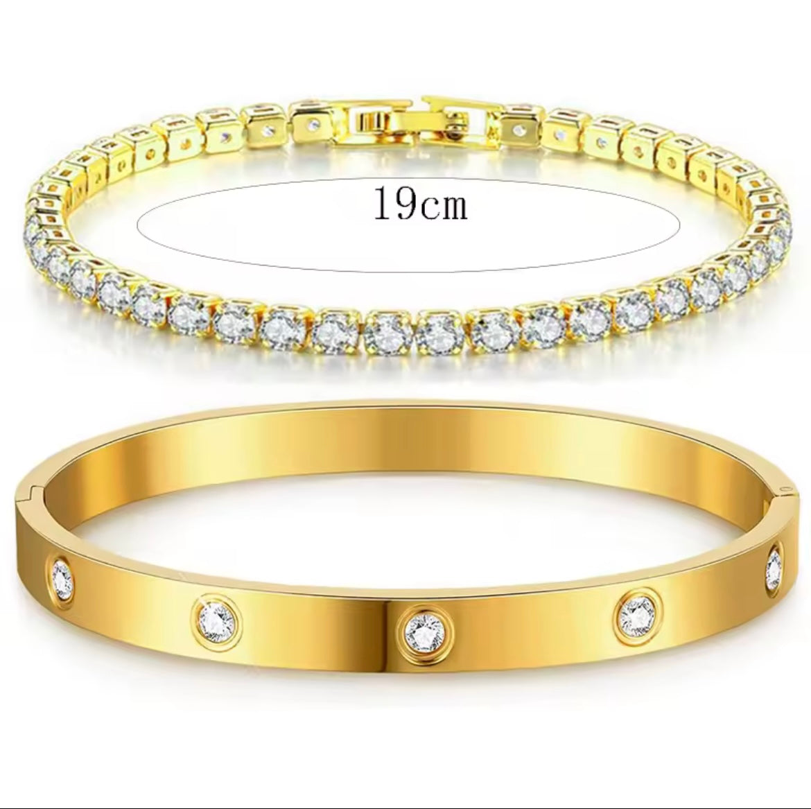 Bracelets empilables en acier inoxydable plaqué or ou argent avec zircones cubiques scintillantes.