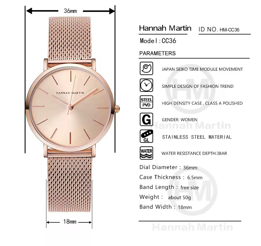 Ajoutez une touche de raffinement avec la montre Hannah Martin, conçue pour les femmes modernes qui aiment allier style et qualité.